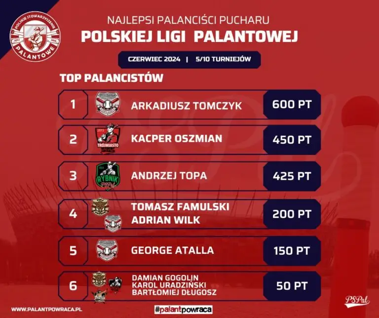 Prezentujemy oficjalnie ranking po 5 turniejach z cyklu Pucharu Polskiej Ligi Palantowej.