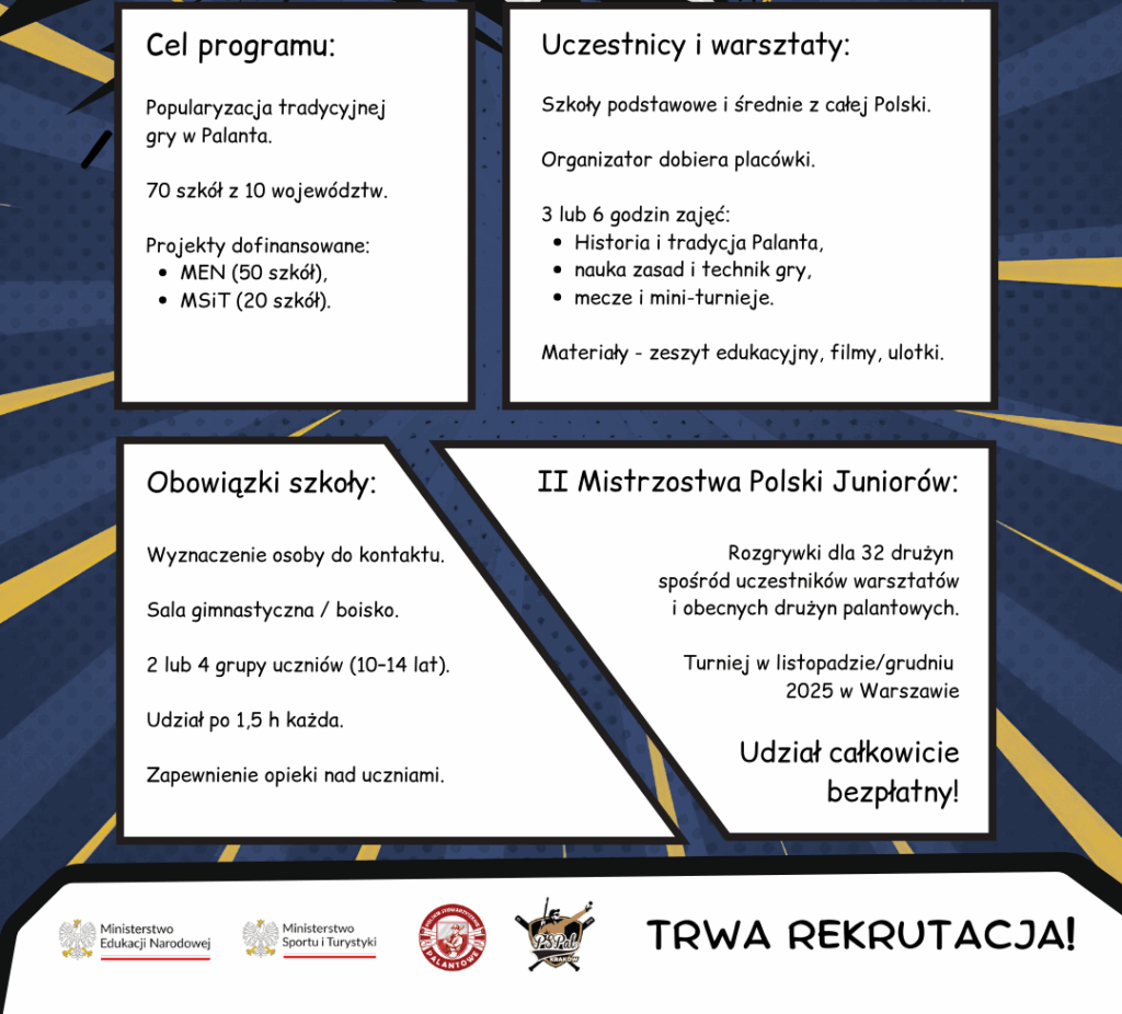 Palant to coś więcej niż gra. To część naszej kultury i dziedzictwa sportowego. Dzięki programowi „Palant powraca w Twojej szkole” tysiące uczniów w całej Polsce odkryje tę unikalną dyscyplinę, a najlepsi zmierzą się na mistrzostwach ogólnopolskich.